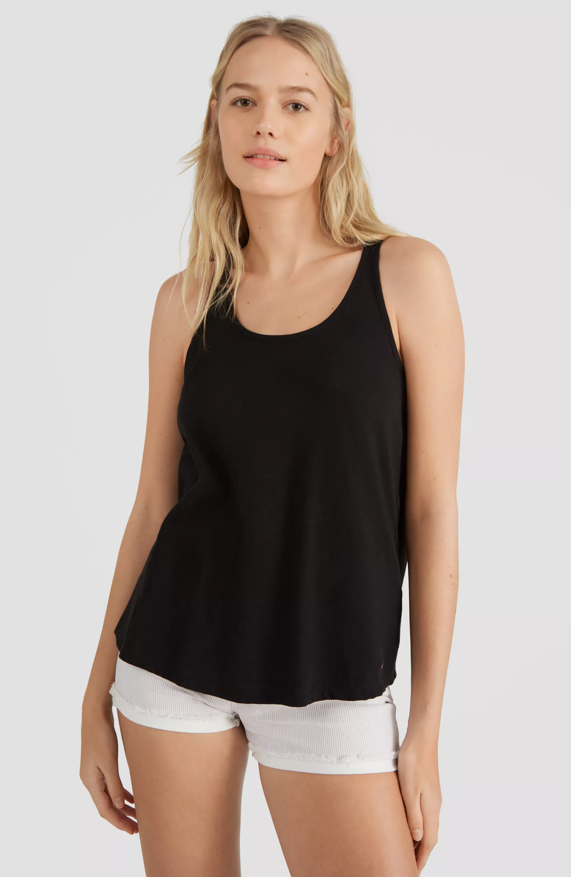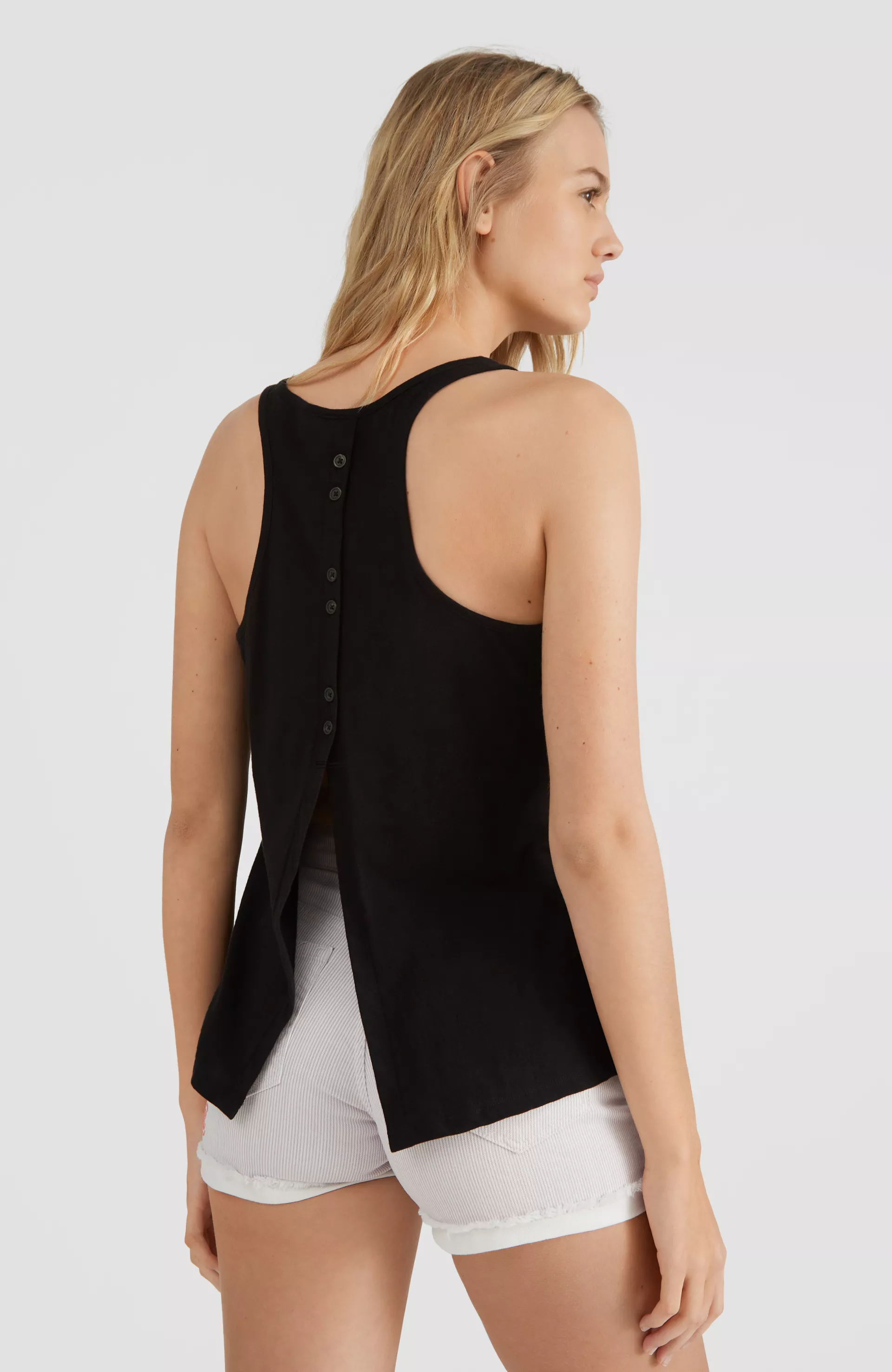 Dámske letné tielko so zadným zapínaním na gombíky a spodným širokým výstrihom. Štýlový letný kúsok vyrobený z čistej bavlny na horúce letné dni. Modelka má výšku 181cm hrudník 80cm, pás 62 a boky 89 a oblieka veľkosť S.